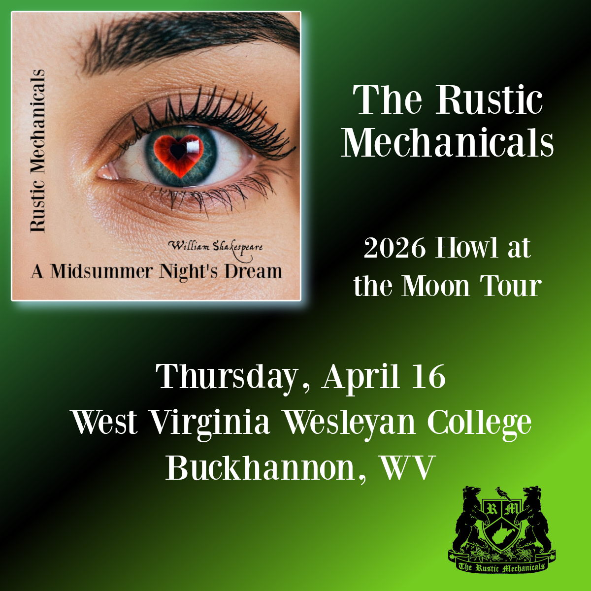 The Rustic Mechanicals, West Virginia’s only professional Shakespeare troupe, are thrilled to announce a special free performance of “A Midsummer Night’s Dream” at West Virginia Wesleyan College on Thursday, April 16, 2026.