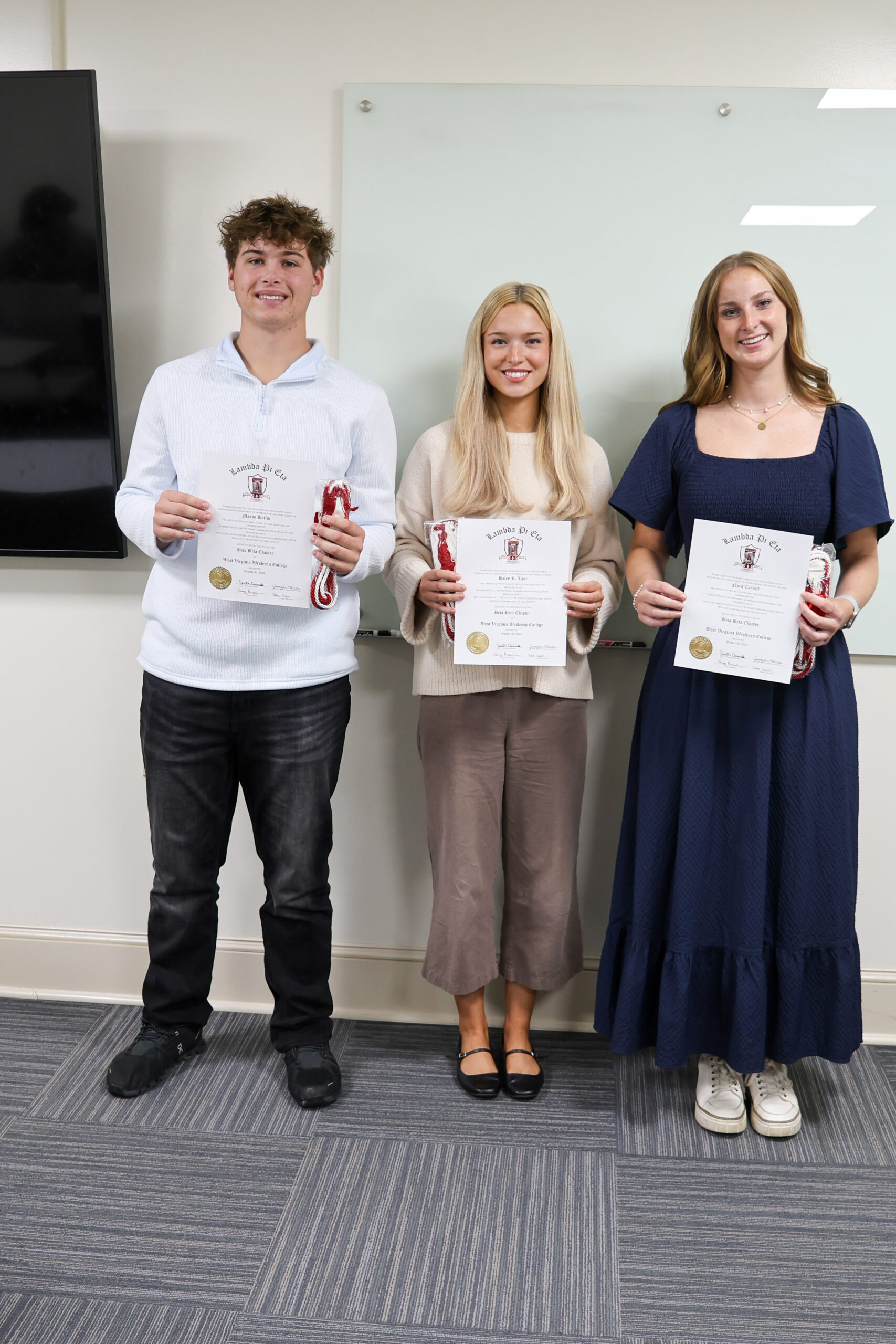 Nora Carroll ‘27, of Myrtle Beach, South Carolina; Mason Halfin ‘27, of Moatsville, West Virginia; and Haley Lane ‘26, of Buckhannon, West Virginia, qualified to join the Lambda Pi Eta Honor Society on October 30, 2025.