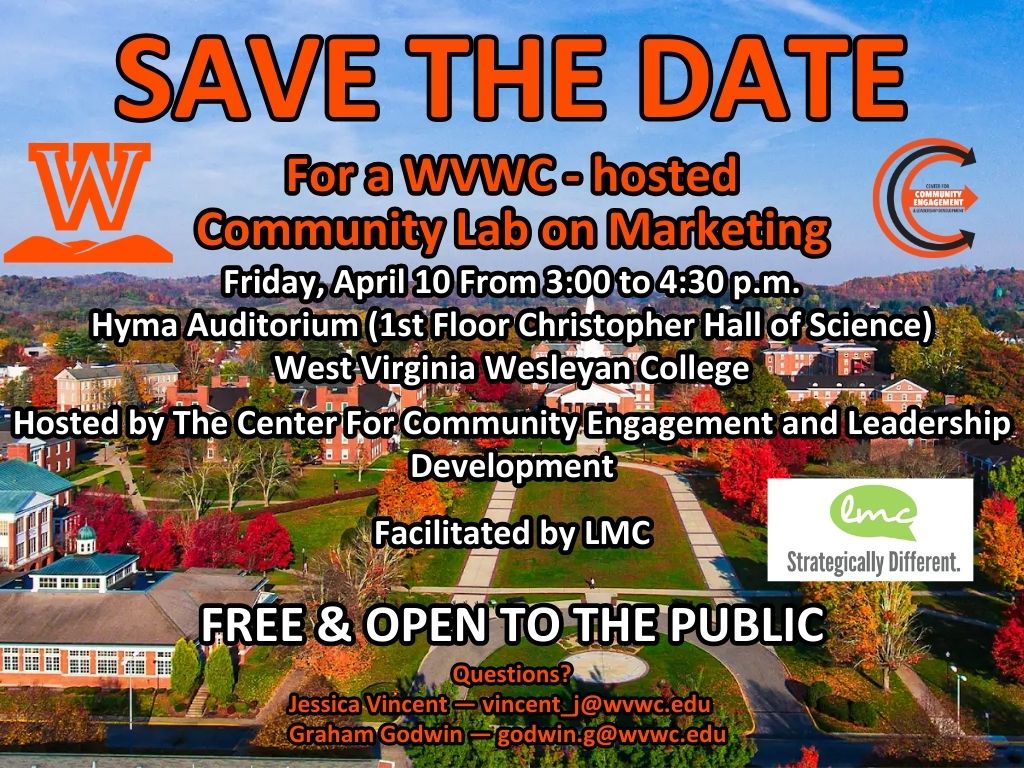 Continuing its commitment to strengthening community capacity across the region, the Center for Community Engagement & Leadership Development (CCE) at West Virginia Wesleyan College will host a Community Lab on Marketing titled “Marketing Strategies that Resonate,” presented by Agency LMC, on Friday, April 10, from 3:00–4:30 p.m. in Hyma Auditorium (first floor of the Christopher Hall of Science) on Wesleyan’s campus.