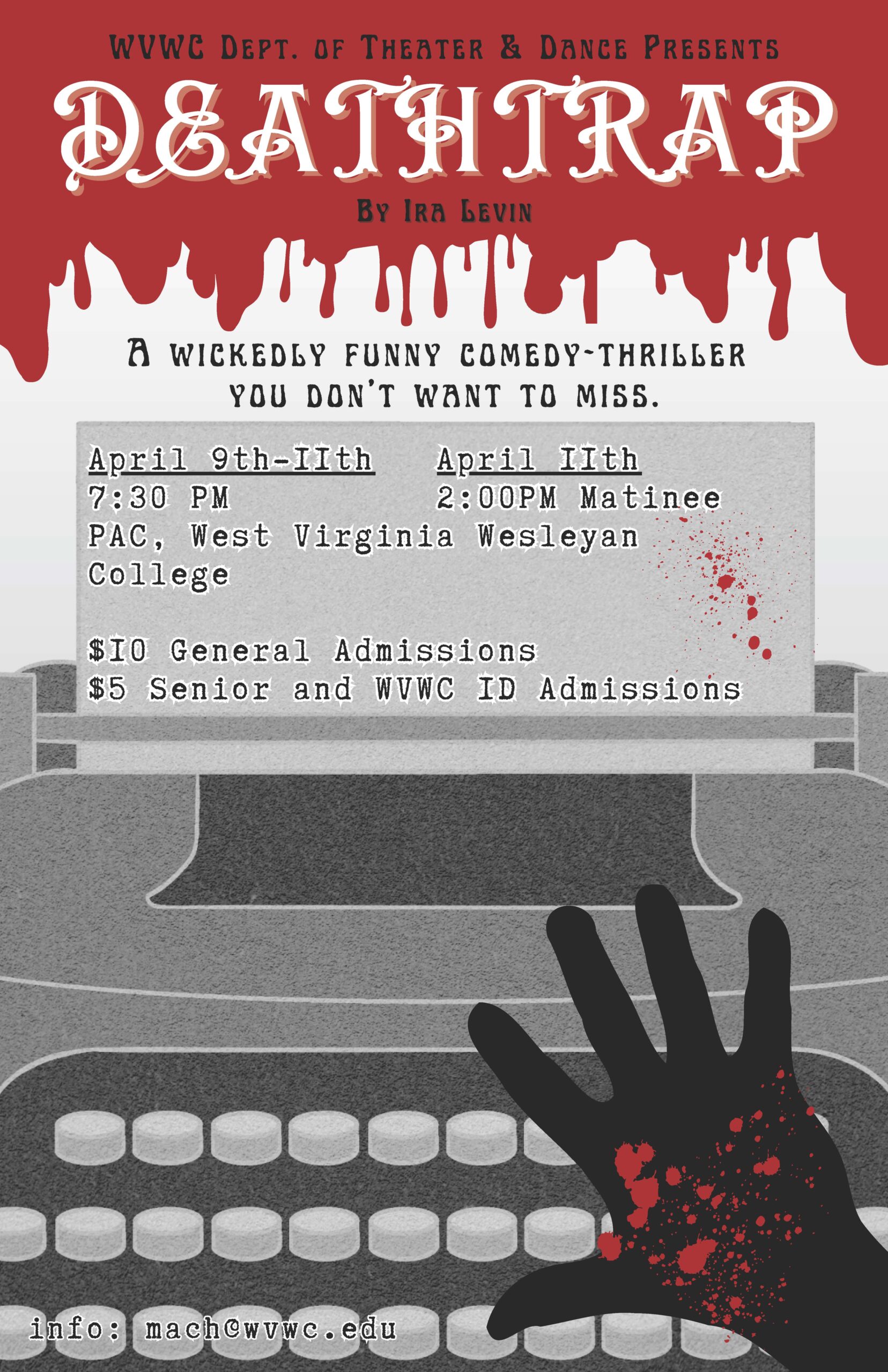 BUCKHANNON, West Virginia — From the stage to the big screen, “DeathTrap” by Ira Levin has been popular from the 1980s to today, even being made into a movie starring Michael Caine and Christopher Reeve. West Virginia Wesleyan College’s Department of Theatre and Dance will present its adaptation of “DeathTrap” April 9-11 in the Virginia Thomas Law Center for the Performing Arts.