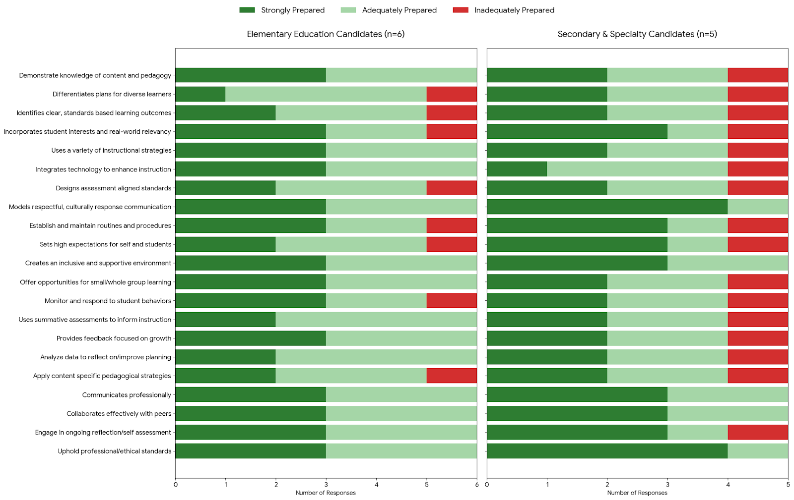Based on the CAEP response from the Spring 2025 site visit, the EPP is reporting on new surveys and data captured during the Fall 2025-Spring 2026 academic year. We have utilized a multi-layer assessment approach to evaluate the satisfaction of our employers and stakeholder involvements. We include Educator Preparation Program Advisory Council (EPPAC) minutes from December 2, 2024 to present to document the continuous dialogue between the program and our PK-12 partners, ensuring that stakeholders have a direct voice in program governance and clinical design. The Completer Survey and Employer Survey capture the transition from candidate to professional. Finally, we include the Mentor Teacher Feedback Survey as a critical data point. While we are unable to disaggregate some of the data due to a small number of participants (n), it provides us a snapshot of information.